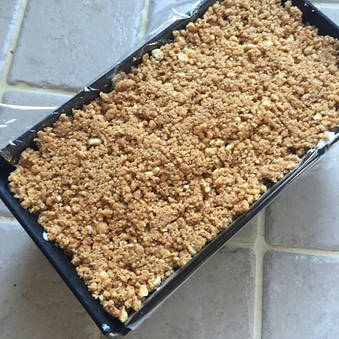 ラップを敷いたパウンドケーキに詰めます。このままでもおいしいですが、冷凍庫である程度固まってからビスケット生地を乗せて押さえつけるのも美味しいです♪
