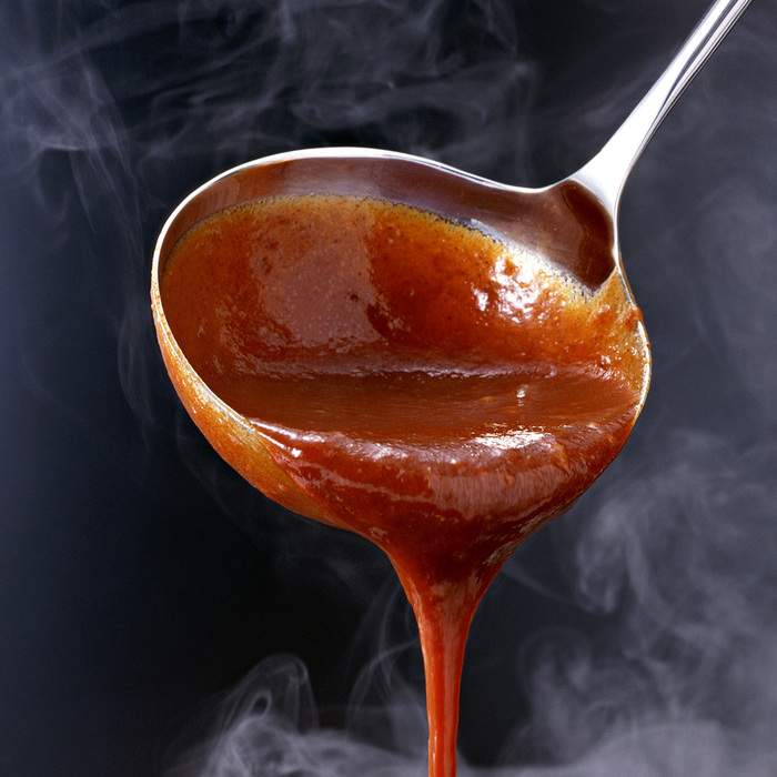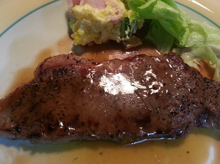 ステーキ用のお肉を焼き、フライパンに残った肉汁にコンソメスープを投入し、しょうゆ、ソースで味付け。水ときした小麦粉で少しとろみをつけます。そのソースをファットセパレーターに入れ、脂肪分が分離したら下層のソースだけをステーキにかけます。