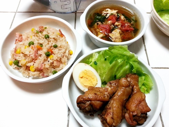 鶏肉の紅茶煮の煮汁を脂肪オフしてピラフ、スープにも活用する美味しくてヘルシーなセットメニューです。鶏手羽元で紅茶煮を作ります。煮汁に調味料を加えて軽く火を通したあと、鶏肉とゆでたまごをつけこみます。つけこんだあとの煮汁をファットセパレーターで脂肪分離します。脂肪オフした煮汁をピラフの炊き込み用スープとして使います。また残った煮汁に野菜や卵を入れてスープにします。