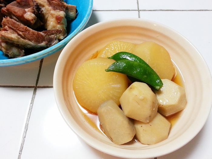 煮豚の煮汁を脂肪分離して、里芋と大根のにっころがしに活用します。