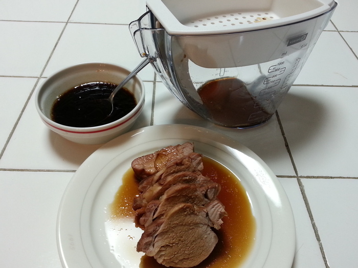 豚ブロック肉と調味料をオーブンバッグに入れてオーブンで焼きます。残った焼汁をファットセパレーターへ。脂肪を除いた部分を注ぎだし、タレとして使います。