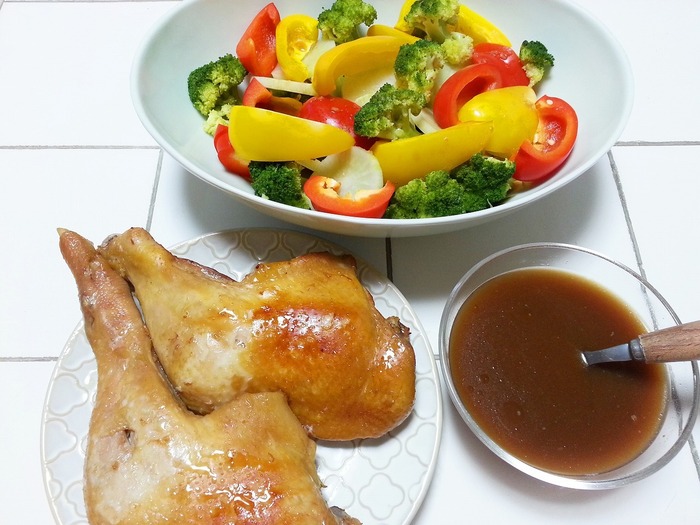 ローストチキンの煮汁を脂肪分離してチキンと温野菜サラダのタレに活用します。
