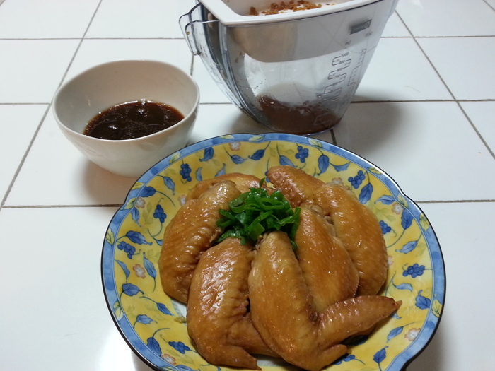 フライパンで鶏手羽先を焼き目をつけ、水・調味料を加えて煮焼きします。煮汁をファットセパレーターで脂肪分離し、下層を注ぎだしてタレにします。
