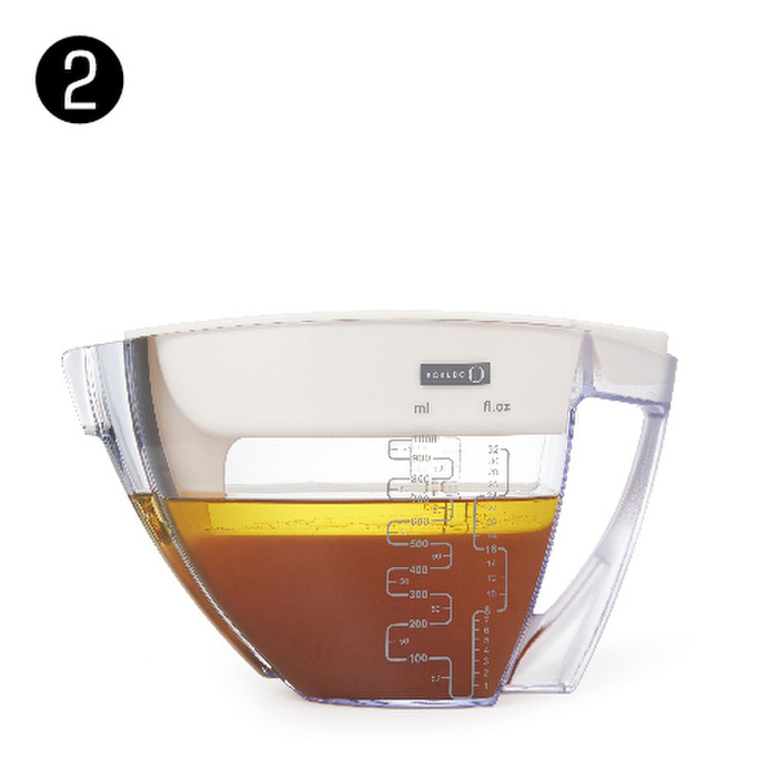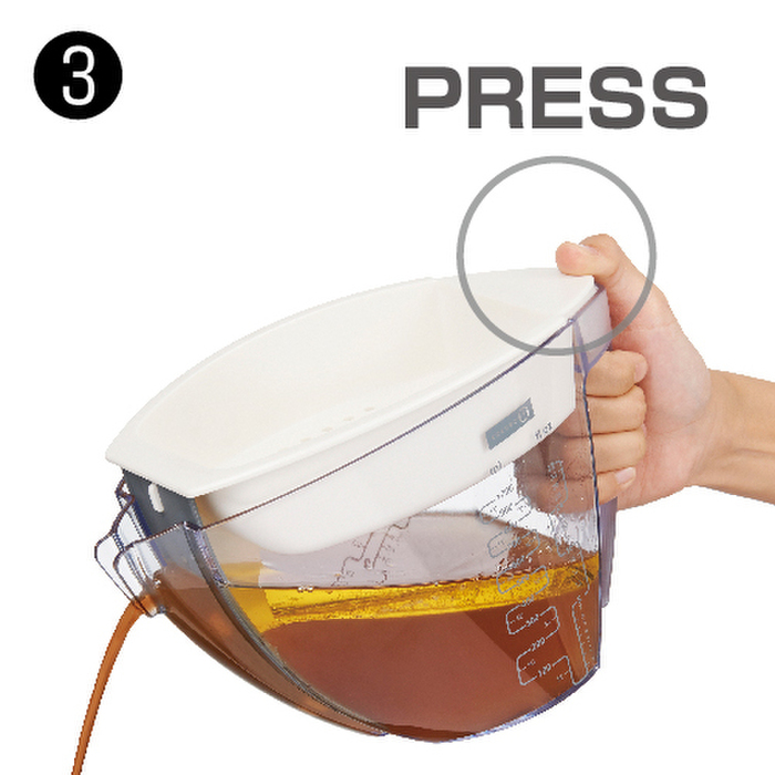 3)取っ手上部のタブを親指で押しながら脂分がカットされた下の部分の汁だけを注ぎ出します。