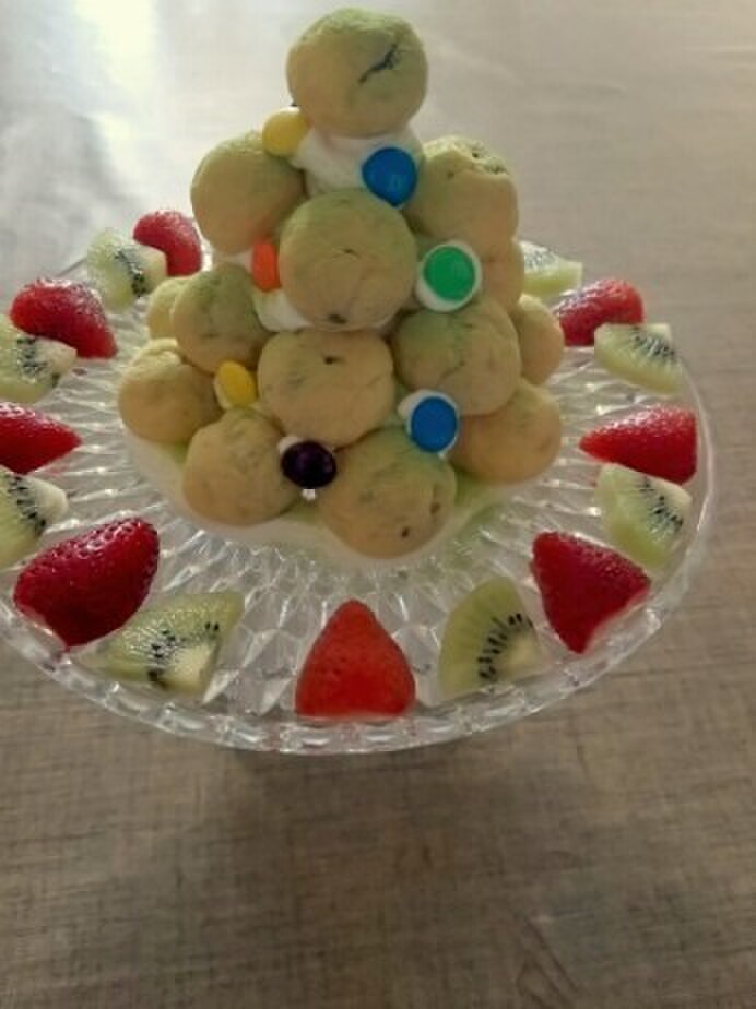 クリスマスらしく赤と緑…いちごとキウイを周りに飾りました