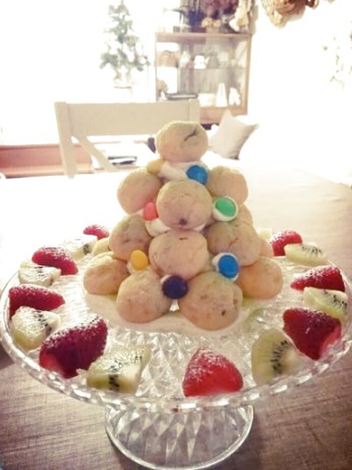 その上にチョコシューを並べます