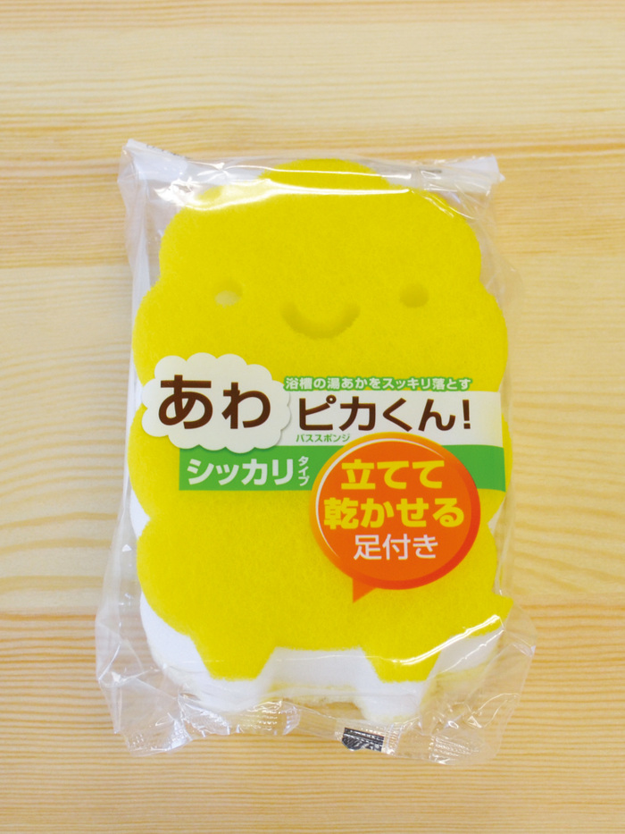 ちょこんと立ってるかわいいヤツ、これ、お風呂掃除用のスポンジなんです。その名も「あわピカくん」。2本足でちょこんと自立する姿がキュート!立てて乾かせるので、気持ちよく使えるという機能性も併せ持つスグレモノです。