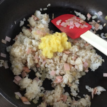 ③フライパンにバターをひき、②の玉ねぎを入れて焦げないように炒めます。ハムを入れてごはんを入れ全体に混ぜ、塩こしょうします。