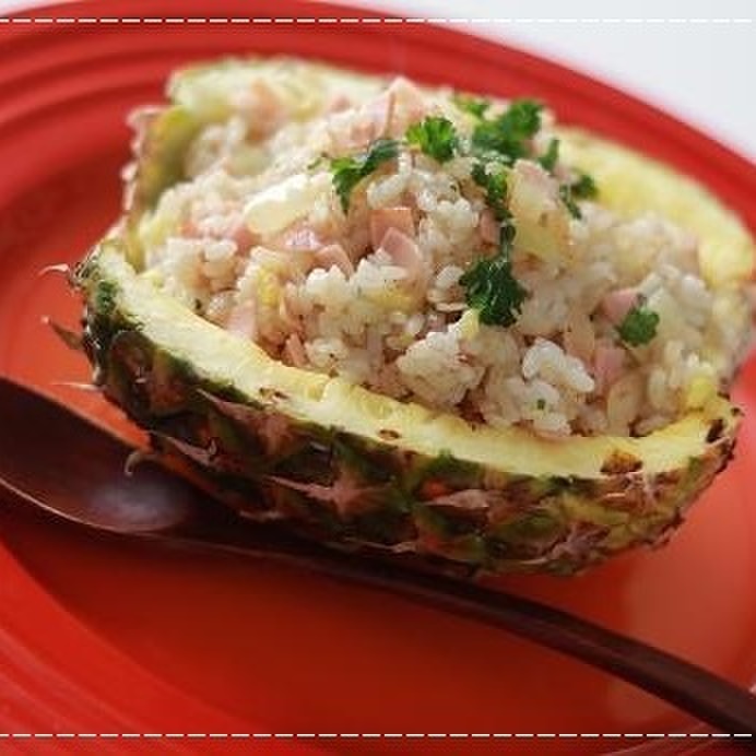 ④最後にパイナップルを入れ、全体に炒め、パセリを散らしてパイナップルの器に盛ります。