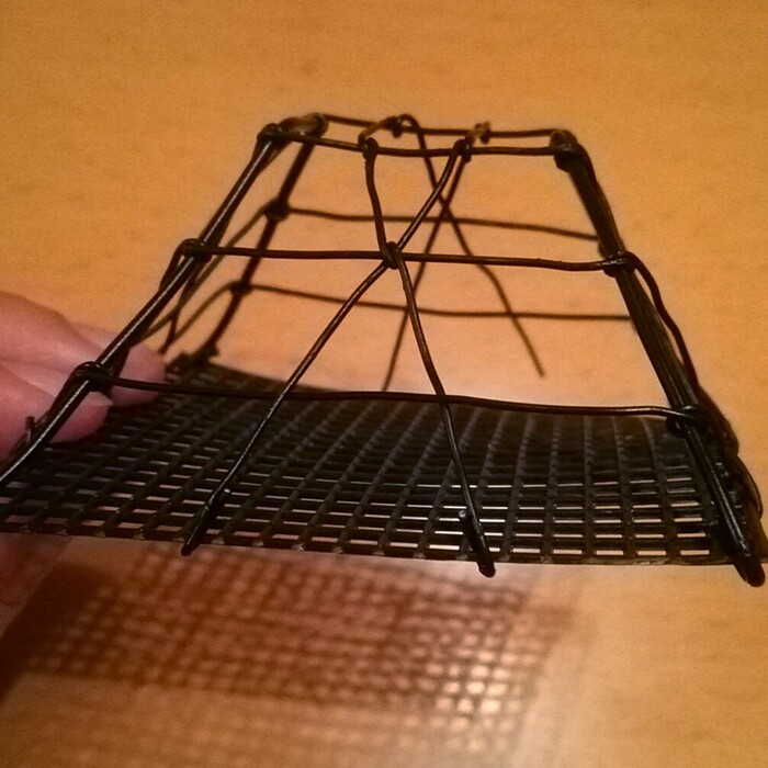 ②屋根の横部分、鉢底ネットを4等分したくらいのところから細いワイヤーをかけ、基本骨格の台形の一辺に平行に上に向かいます。屋根の頭頂部分でワイヤーを一周させ、反対側に繋げます。