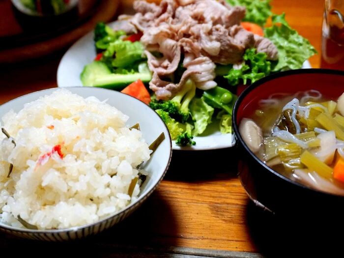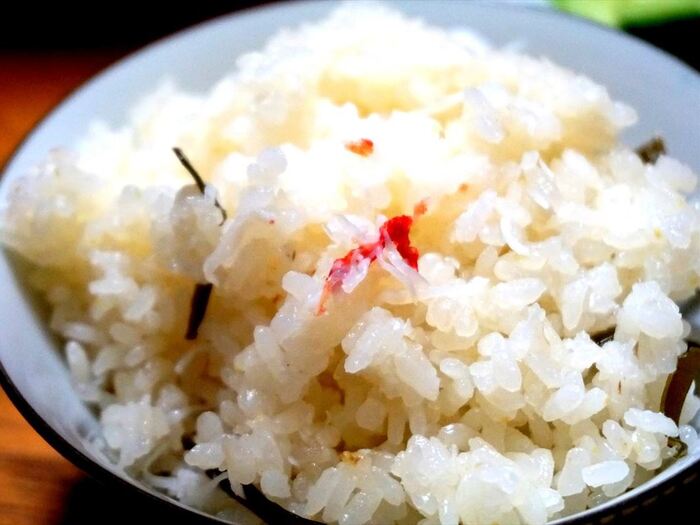 ご飯に水、白だし、塩、醤油などを合わせて4合の分量の水分に合わせる。