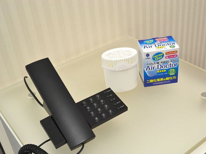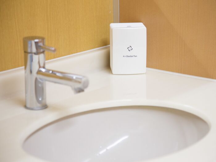 電動ファン付き「エアドクターファン」。電池でファンが回って室内に二酸化塩素を拡散させます。除菌・ウイルス・ニオイ対策に。