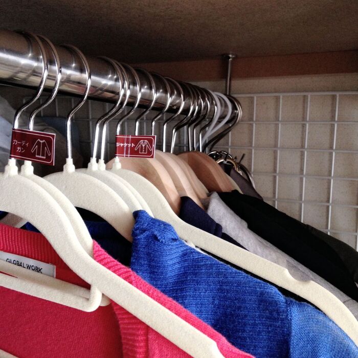 アイテムごとにハンガーで仕切ることで同じアイテムが揃い、取り戻しやすくて探しやすくなります。