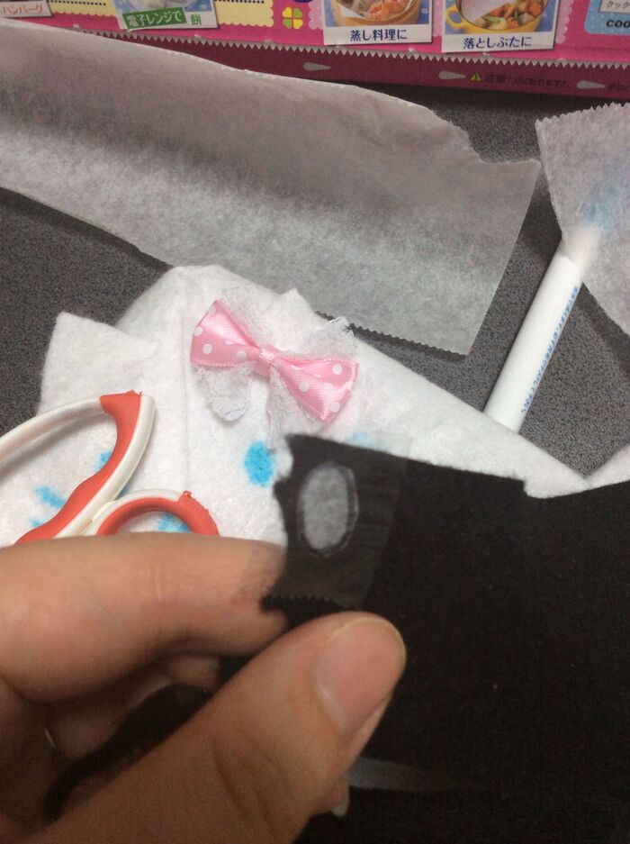 さらに、カットしたイラストを目は黒いフェルトの上にテープで貼り、輪郭に沿ってハサミでフェルトをカット。