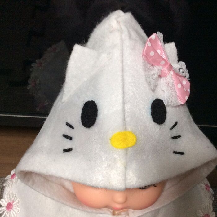 キティちゃんの耳は、針と糸で縫い付けてももちろん良いですが、私は今回時短のため、裁縫用ボンドを使いました。リボンは取れにくいように、しっかり糸で縫い付けています。