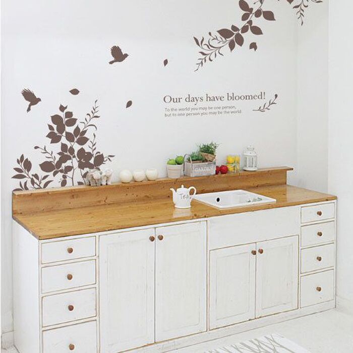 大胆にアレンジされたウォールステッカーで、キッチンにナチュラルかつモダンな雰囲気をプラス!
