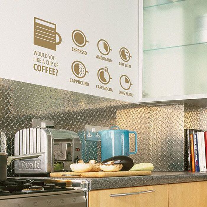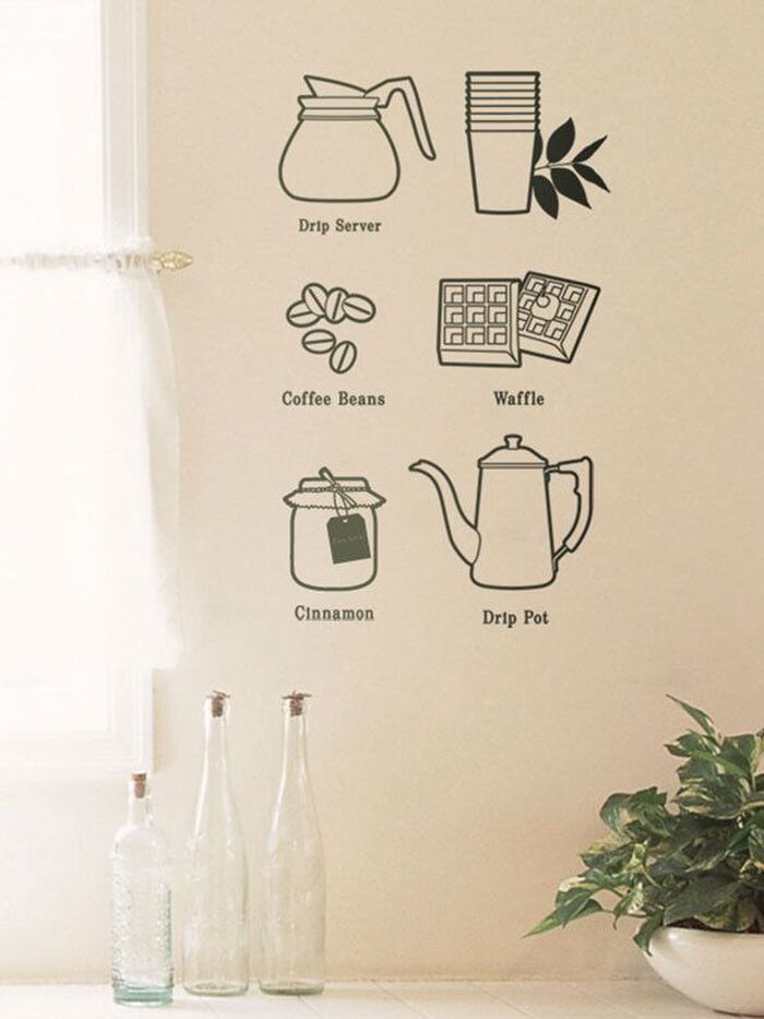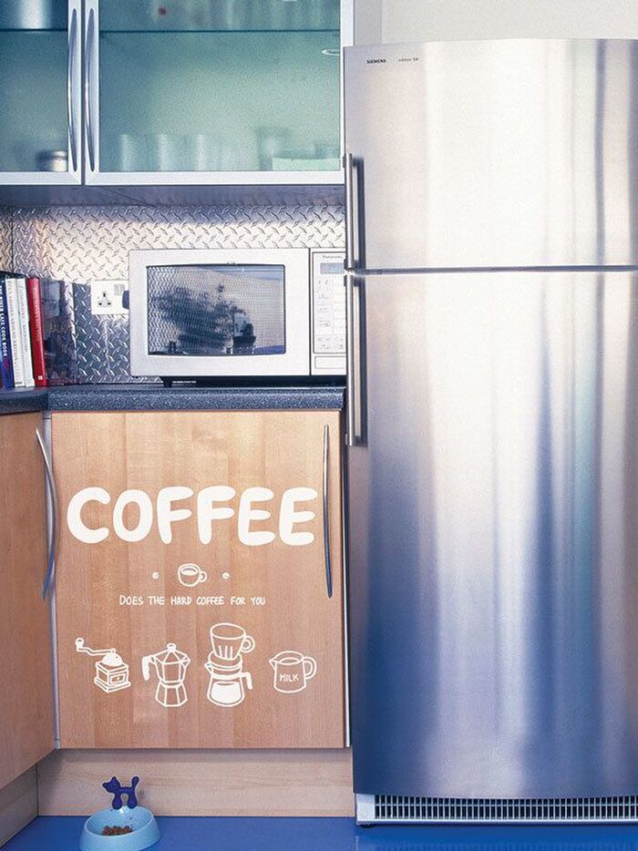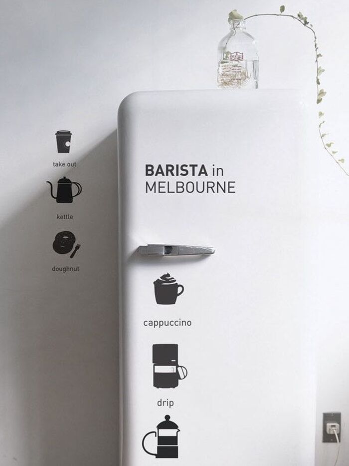 ステッカーでキッチンをカフェ風に仕立てるのもおすすめのアレンジ。コーヒーの入れ方をかわいくデザインした「バリスタ」は、レシピ兼、インテリアとしてユニークに使えるアイテム。