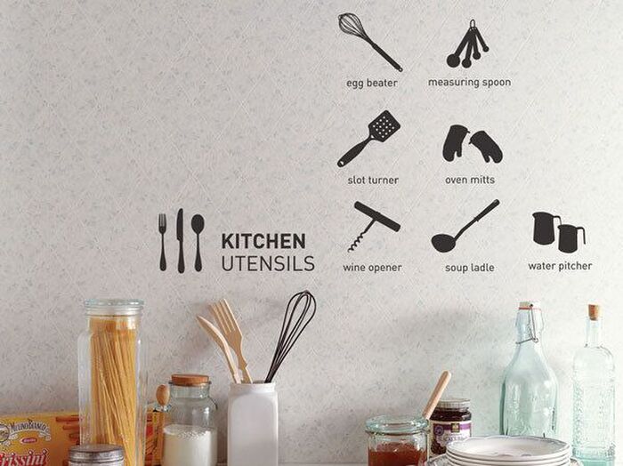 キッチンにまつわるアイテムをキュートにデザインしたステッカー。2色使いで、キッチンをポップに彩ります。