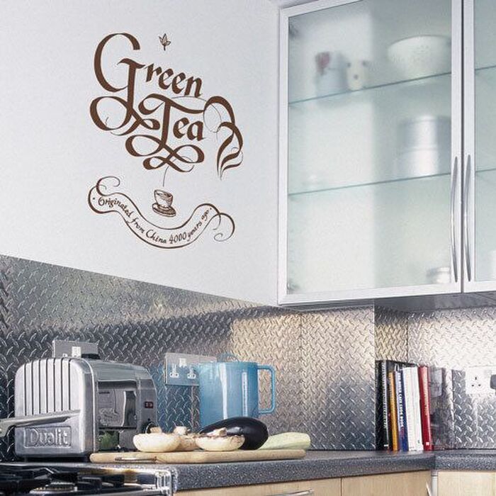 ちょっとシックに仕上げたいなら、カリグラウィーのデザインがおしゃれな「カリグラフィー・グリーンティ」を。一転変わって、キッチンを大人っぽい空間に仕上げます。