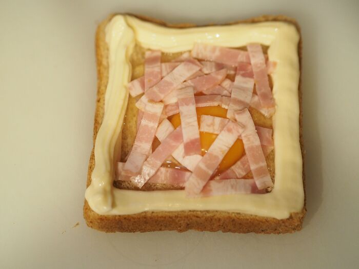 2、1のふちの内側に卵をそっと割り入れ、細切りしたベーコンを散らします。