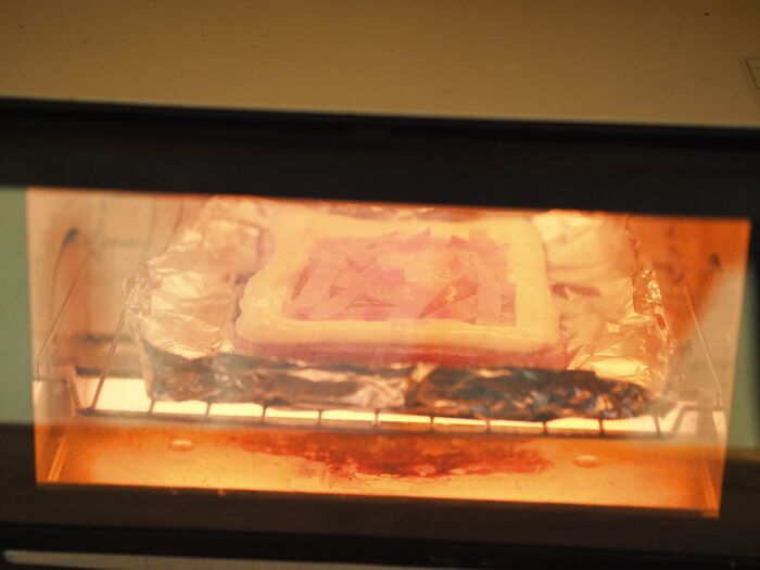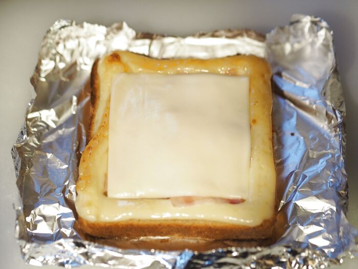 4、3の上にとろけるスライスチーズをのせ、さらに1分ほど焼きます。