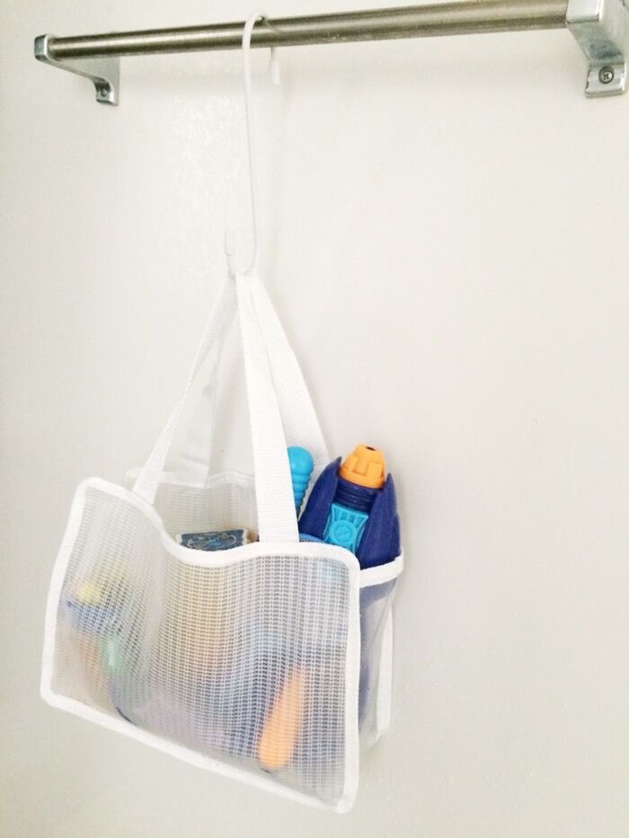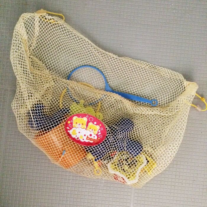 100均商品で、メッシュの袋に吸盤でくっ付けて使います。