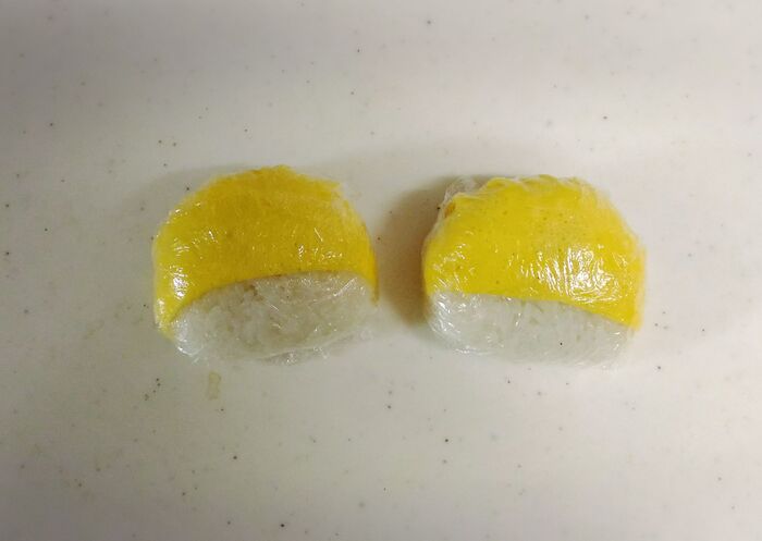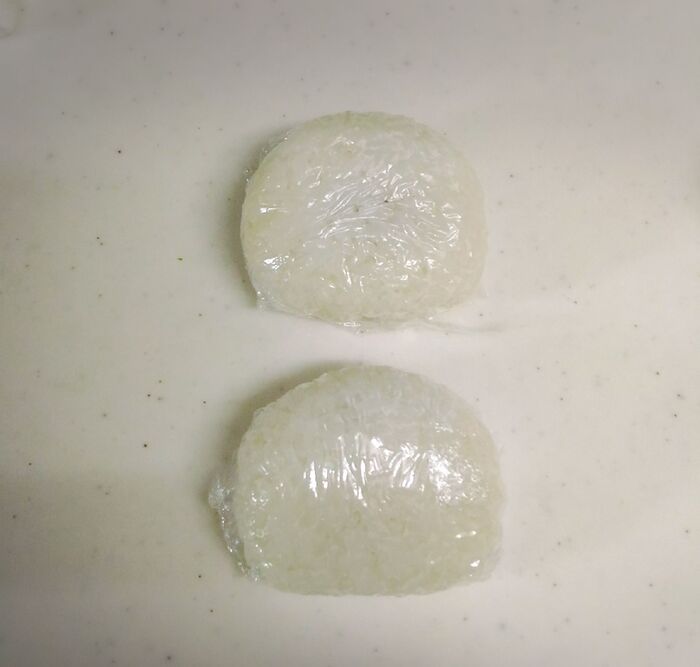 ラップに包んだまま、楕円形に握ります。