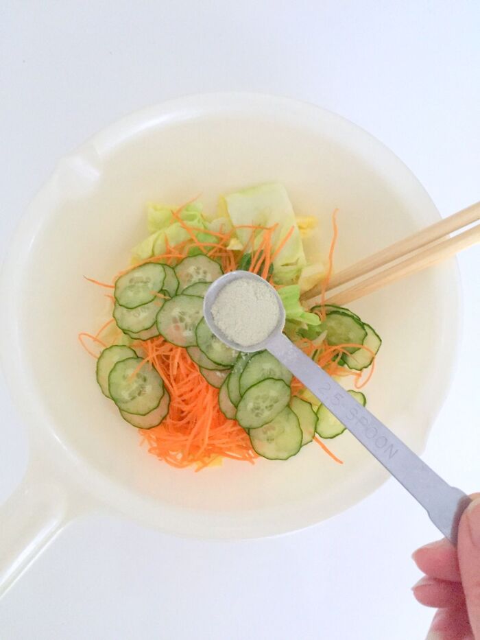そして、それを混ぜるだけ。最後に、昆布茶と塩で味付けをします。