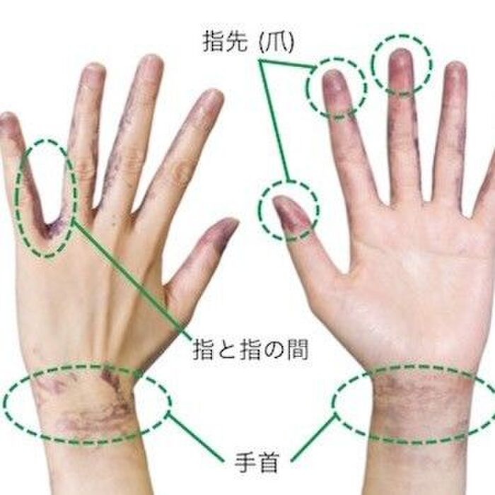 写真の黒っぽい部分が、洗い残しの多いところ。指先や爪、指と指の間、手首などはしっかり洗えていないことも多いんですね。