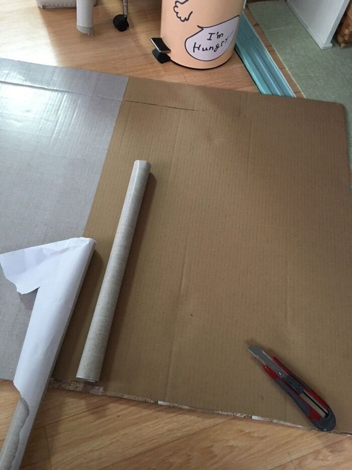 5個の押しピンで上部を固定。段ボールなので、軽いしうまく固定できます。