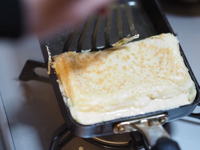 4、1分半ほど焼いたら、奥から手前に生地を折ります。その後、生地をひっくり返して2分ほど焼きます。
