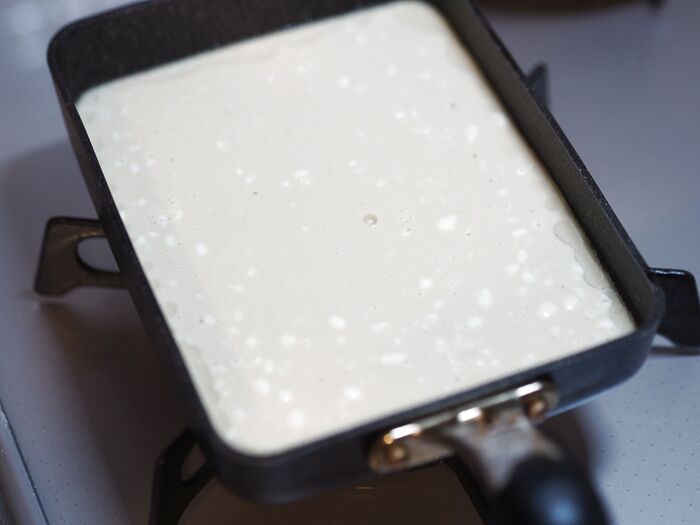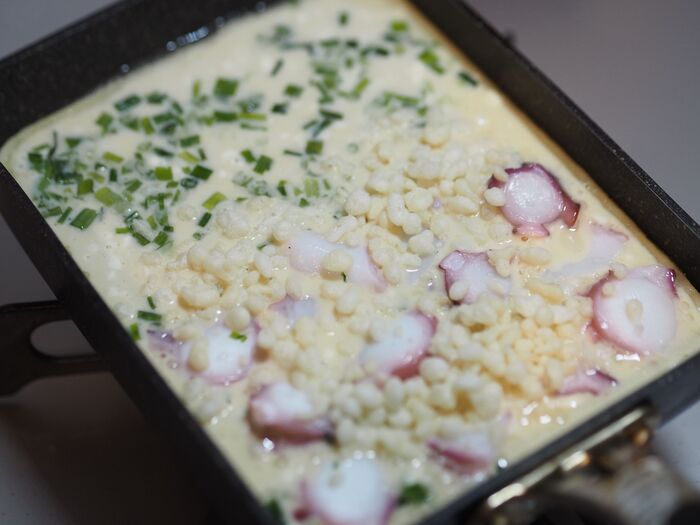 2、卵焼き器でサラダ油(分量外)を熱し、そこに1の生地を流し入れます。
