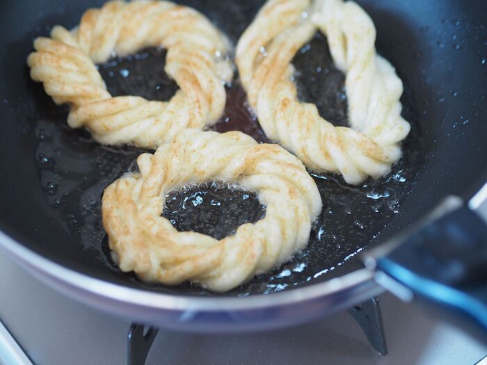 今回のようにねじって成形する以外にも、丸めてお団子のような形にしてもかわいらしいですよ。あと、揚がったうドーナッツにシナモンやきなこなどをふりかけると、また違った味わいが楽しめてオススメです。