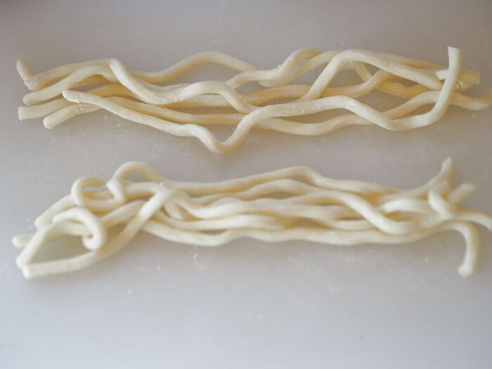 2、1のうどんを6本ずつ取り出し、平行に並べたら、真ん中で切ります。