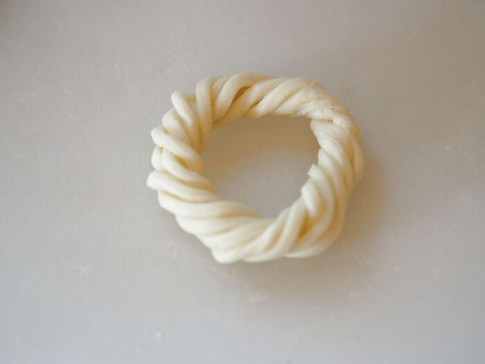 3、2のうどん6本の両端を指で潰してまとめ、くるくるとねじってドーナッツ型を作ります。