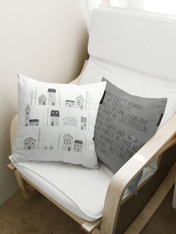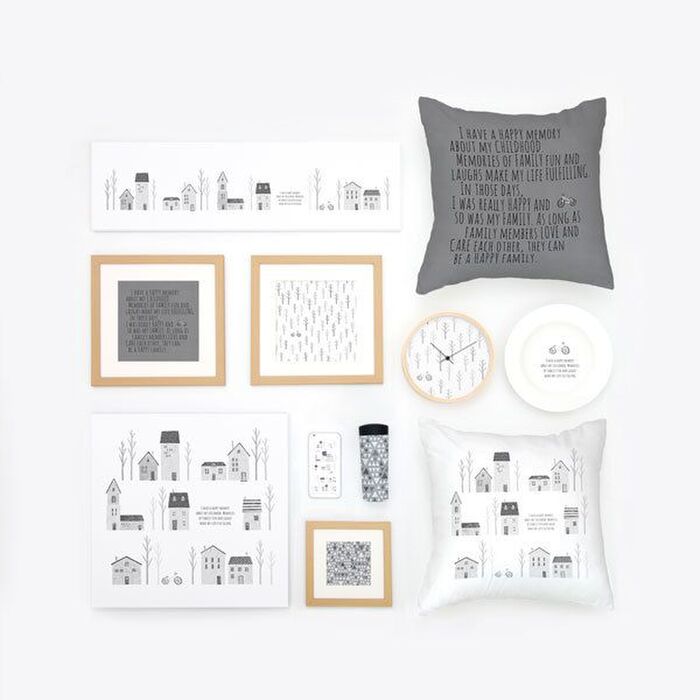 幼い頃の家族との幸せな思い出を、落ち着いたグレートーンを基調に優しいタッチのイラストでデザインしたクッション「ワンデイ」。
