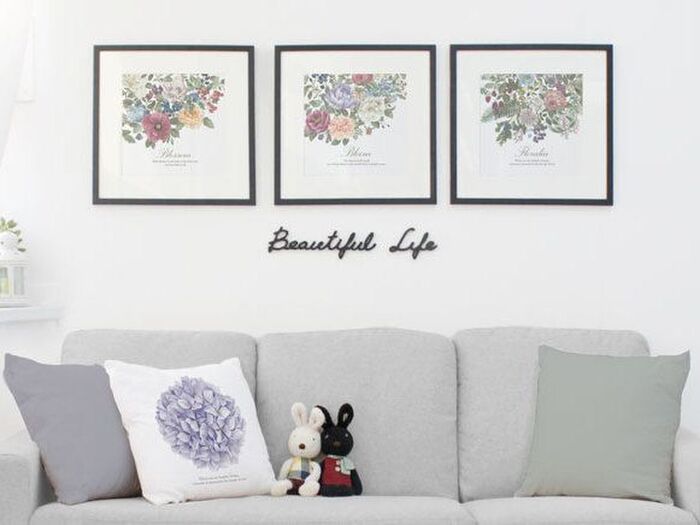 華やかなカラーとデザインなので、モダンな空間にポイントとしてそえてみても。写真のように同じデザインをアートフレームで華やかに飾り、クッションでポイントを与えるコーディネートもおすすめです。