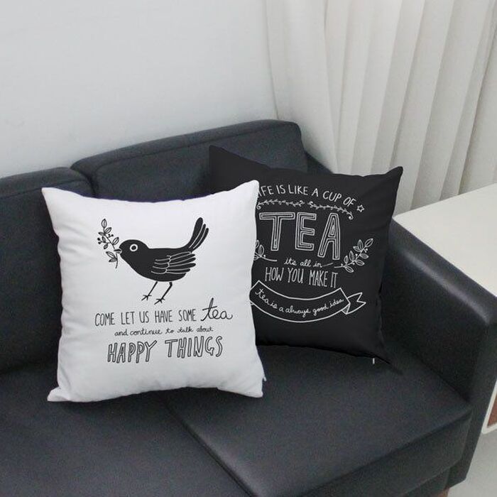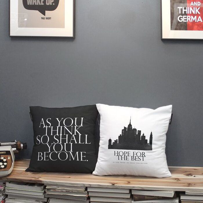 洗練のシルエットと印象的なメッセージが人気のクッション「リマインド」シリーズのうち、シンプルなタイポグラフィタイプは表は白地、裏は黒地のシックなデザイン。