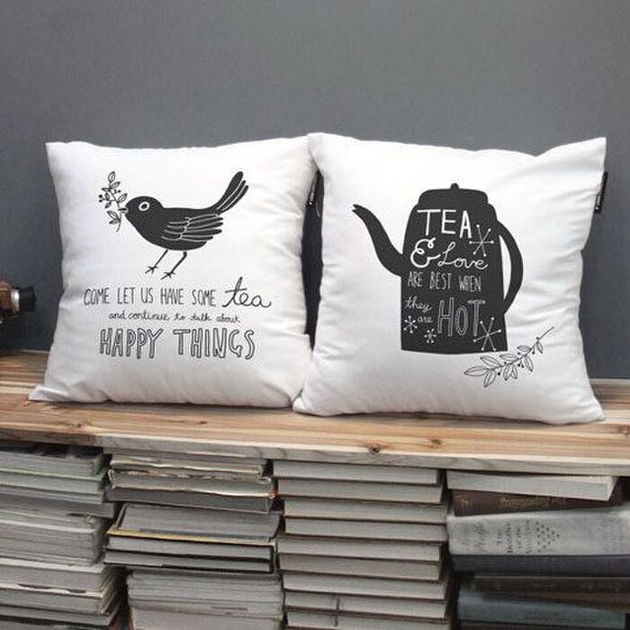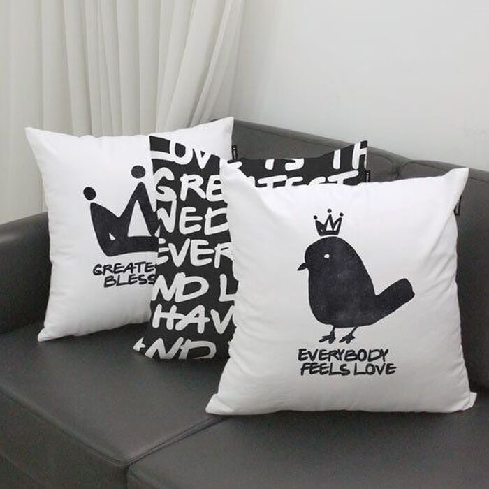 ブラック&ホワイトのモノトーンながらも、太めのタイポグラフィが愛らしいクッション「デイリーラブ」は、表面は白地に黒文字、裏面は黒字に白文字のデザイン。