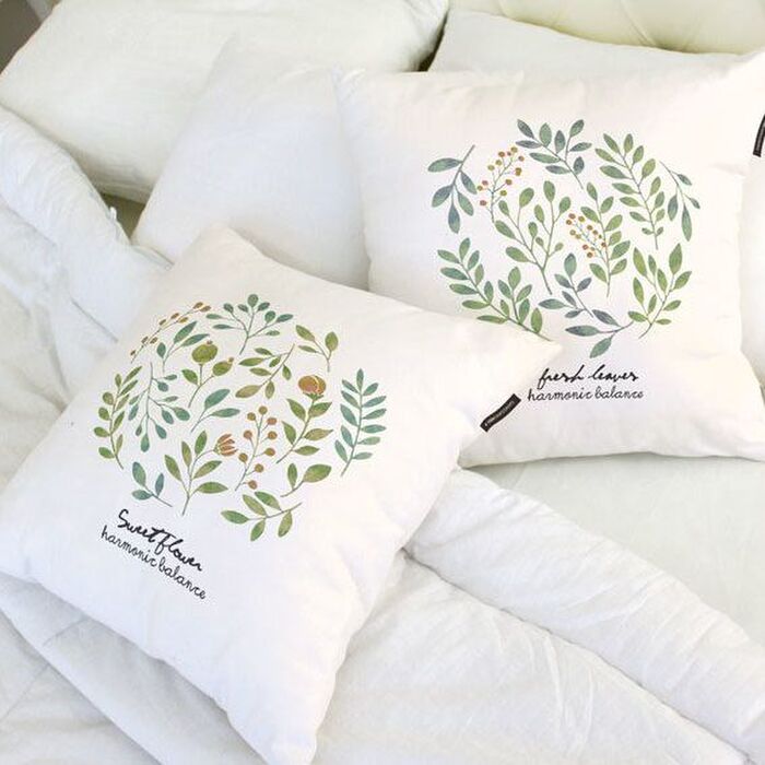 ステンシルのような繊細なカラーリングで、空間に優しいグリーンの彩りをそえるクッション「フラワーリース」。裏面は文字だけのシンプルなデザインで構成されています。