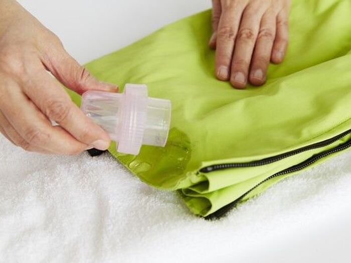ウエアを洗える洗剤を選びます。色あせや型くずれを防ぐおしゃれ着用洗剤(アクロン)がオススメ。