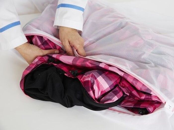 洗濯じわや型くずれ、からまりを防ぐために、洗濯ネットを使いましょう。ファスナーやボタンは閉じて、大型の洗濯ネットに2~3つ折りにして入れます。