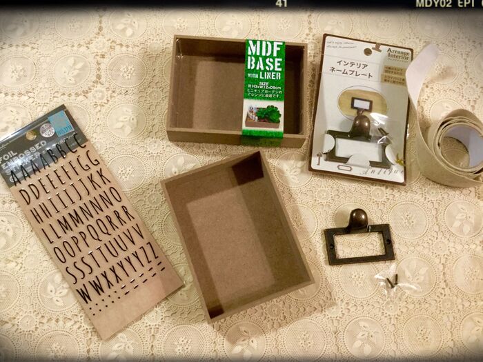 MDFライナー付きベース、アンティークネームプレートを2個ずつ用意し、エンボスシール、麻テープ、レースシートを用意する。
