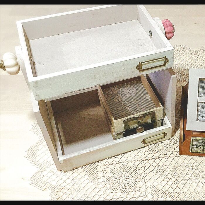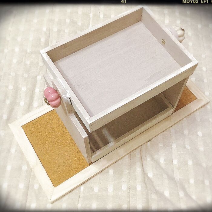 木箱、引き出し用つまみ、桐カッティングボードを各2個ずつ用意し、つまみ以外を、お好みの水性塗料で塗っておき、乾かします。