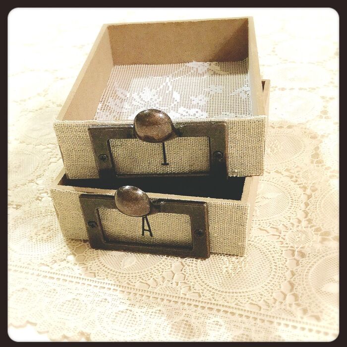 MDFライナー付きベースの内側にレースシートを貼り、前面に麻テープを貼り、ネームプレートを取り付けて、エンボスシールを貼ります。