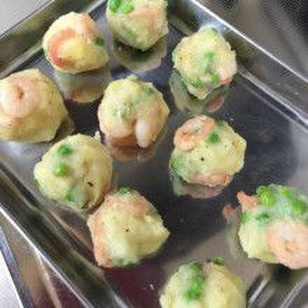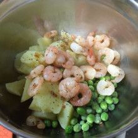 ③①のボウルに、②のむきえびとグリンピースを入れ、塩、ブラックペッパー、包丁で砕いたコンソメキューブを入れて全体に混ぜます。(味見をして、塩、ブラックペパーを調節します。)