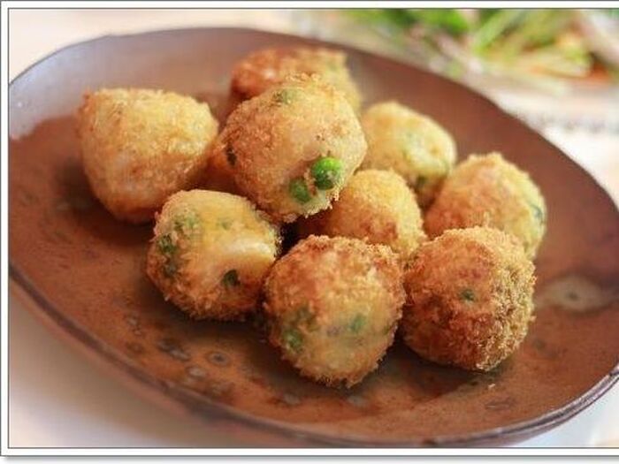 ④好みの大きさに丸め、小麦粉、とき卵、ぱん粉をつけて170度の油で揚げます。