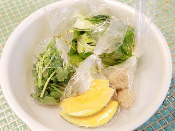 なんですが・・・忙しOLどんぴしゃな筆者は鶏肉団子、水菜、かぼちゃ、+パクチーで