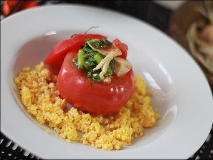 ⑥⑤を①のくり抜いたトマトの器に盛ります。ソースも器の周りに流してください。