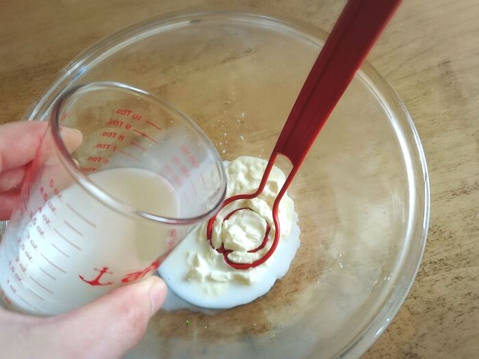 クリームチーズが柔らかくなったら、牛乳でのばし、パスタが絡まりやすい柔らかさにします。